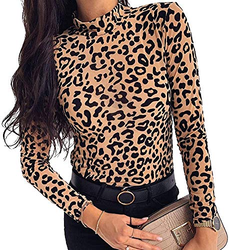 ღDiseño único: Camisa delgada de manga larga, cuello alto, con estampado de leopardo, diseño clásico y de moda, que muestra tus curvas femeninas perfectas y te hace muy sexy y encantadora.