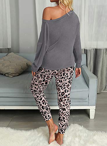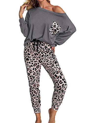 La parte superior de manga larga con bolsillo combina bien con pantalones de leopardo con cordón, este conjunto de pijama de 2 piezas es perfecto para mujeres, jóvenes, mujeres o niñas