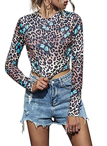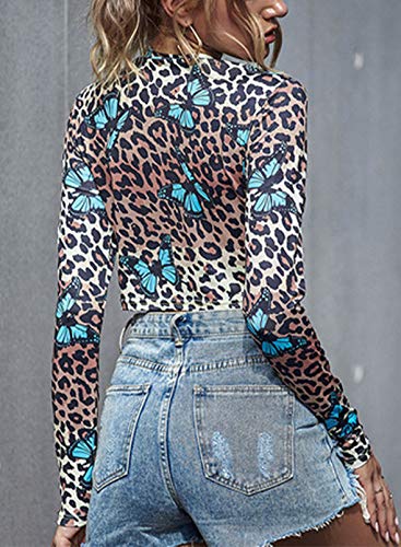 CORAFRITZ Blusa de manga larga con estampado de leopardo, estampado de mariposa, cuello redondo, para mujer