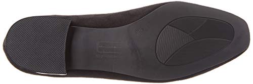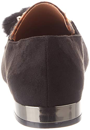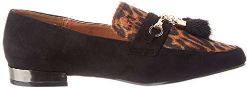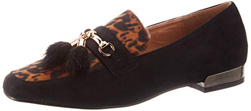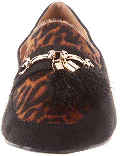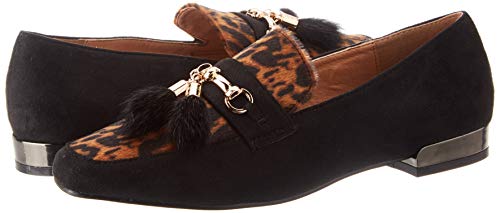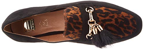 Zapato mocasín de Mujer de la marca Eferri Con un exterior en antelina y un detalle de animal print en el empeine. Tiene unos pompones de pelo en el frontal como toque decorativo. El tacón tiene un acabado metálico.