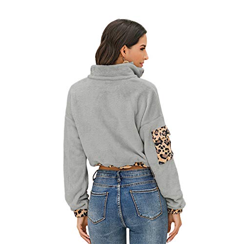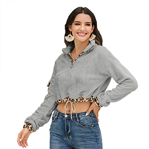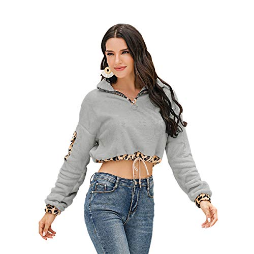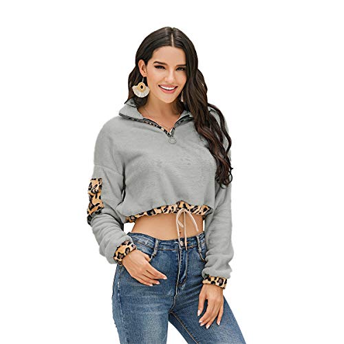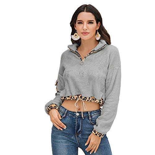 Diseño: sudadera corta para mujer, informal, color liso, cuello con solapa, cremallera frontal, estampado de leopardo en el borde, cordón en la cintura, chic, a la moda.