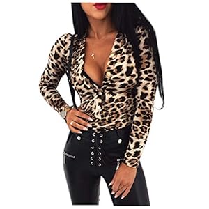 Body Sexy de Manga Larga para Mujer Top Mameluco de Estampado de Leopardo o Serpiente con Cuello en V y Botones Ropa…