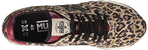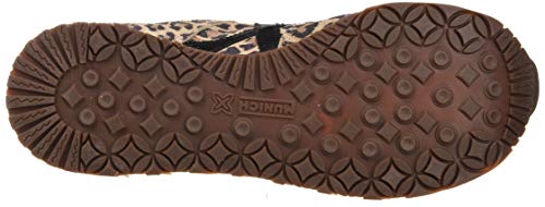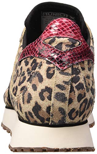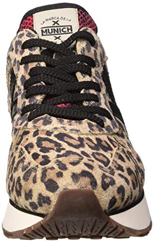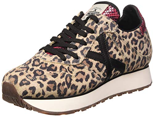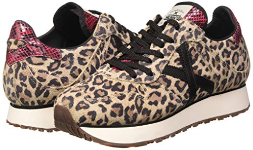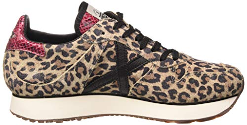 Elaborado en piel efecto leopardo con acabados en piel sintética negra y rosa oscuro; incorpora suela de caucho caramelo con entresuela alta de eva negro-blanco; se puede encontrar de la talla 35 a la 41.