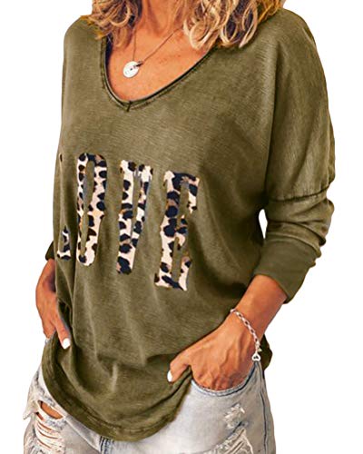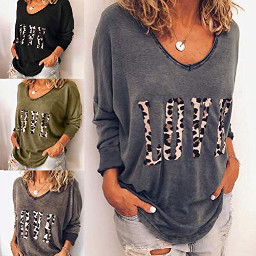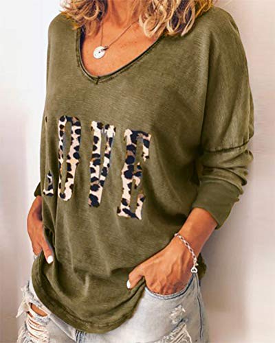 Diseños: Casual camisetas para mujer manga larga suelta camisa color sólido cuello redondo letra de leopardo love print blusas tops.