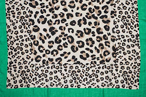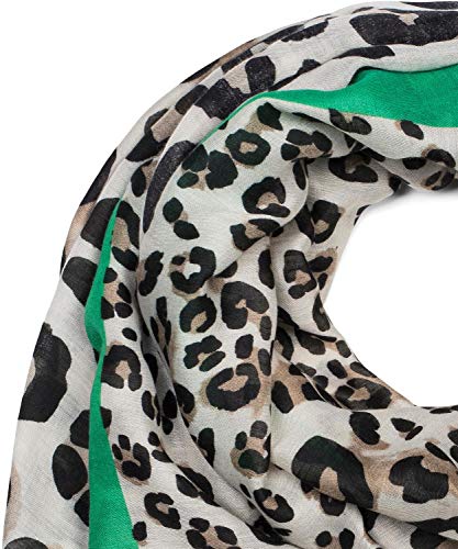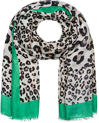 – Chal clásico con deshilachados cortos y estampado de leopardo en diferentes tamaños con un colorido marco