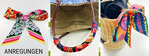 Nuestro pañuelo multifuncional puede llevarse de muchas maneras. Ya sea como un pañuelo estrecho para el cuello, atado de manera informal como un lazo o corbata, como adorno en blusas o vestidos, como cinta para el pelo o simplemente elegante atado al bolso favorito o enrollado alrededor del asa. La creatividad no tiene límite.