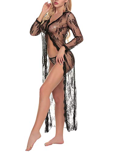 🍓【Diseño único y encantador】 Malla floral de encaje transparente, manga larga, cierre con lazo del lazo del lazo del satén del uno mismo, tanga a juego, vestido largo del vestido del vestido del cordón.
