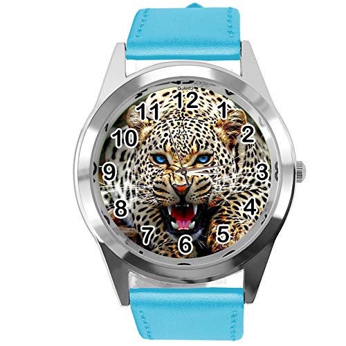 TAPORT Reloj redondo de cuero azul para fans de leopardo
