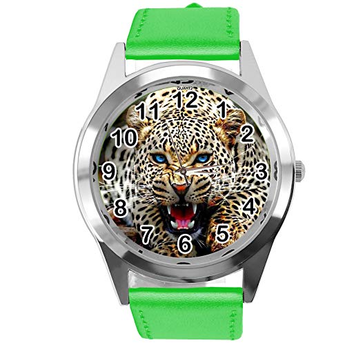 TAPORT Reloj redondo de cuero verde para fans de leopardo