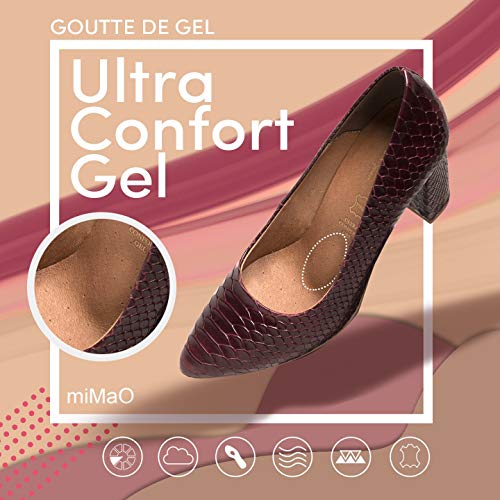 Zapato de piel con tacón alto de 8,5 centímetros. Un zapato estilo salón cómodo gracias a la tecnología del confort de miMaO, nuestra plantilla de piel Gota Ultra Confort Gel.